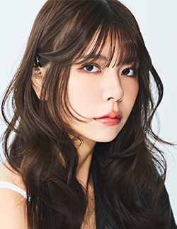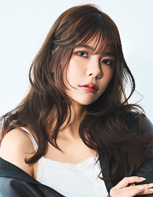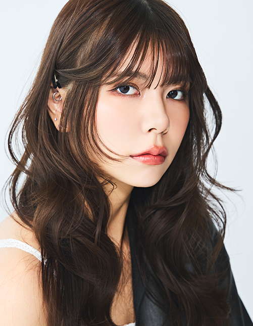 モデルの肌色に合わせ、赤味を抑えた透明感のあるベージュ系カラーに。根元と中間は、赤味やオレンジ味を抑える補色としてGとBをミックス。ブリーチ履歴のある毛先には、コーラルピンクでくすみを抑えるのがポイント。